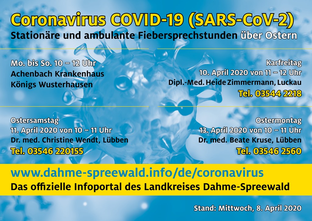 Die Corona-Fiebersprechstunden werden in den genannten Praxen ab Dienstag, 14. April, wieder in gewohntem Umfang durchgeführt. Am Achenbach-Krankenhaus in Königs Wusterhausen stehen Mediziner der Kassenärztlichen Vereinigung in der eingerichteten Fieberambulanz auch am gesamten Oster-Wochenende täglich von 10 bis 12 Uhr zur Verfügung.