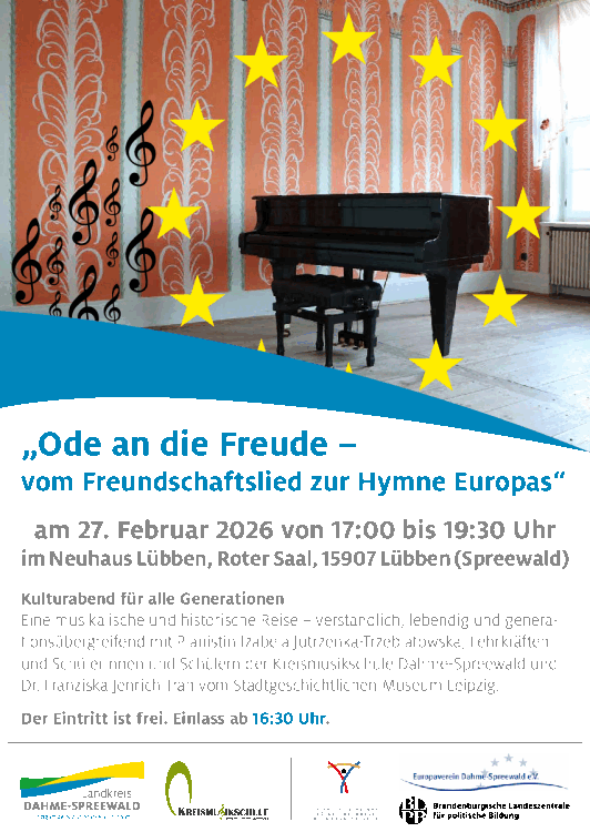Am Freitag, den 27. Februar 2026, laden die Kreismusikschule Dahme-Spreewald und der Europaverein Dahme-Spreewald e. V. zu einem besonderen Kulturabend in den Roten Saal des Neuhauses in Lübben ein. Von 17:00 bis 19:30 Uhr geht es auf eine musikalische und historische Reise – verständlich, lebendig und generationsübergreifend.
