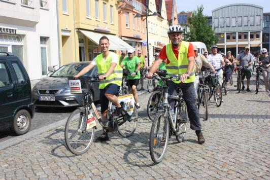 Bei 32 Grad ließen es sich mehr als 60 Teilnehmerinnen und Teilnehmer nicht nehmen für den Klimaschutz zu radeln. Am 01. Juni fand in Lübben die STADTRADELN-Auftaktveranstaltung statt. Mit dabei waren Landrat Stephan Loge und Bürgermeister Lars Kolan. „Im letzten Jahr war es für uns eine Premiere. Die Teilnehmer haben für den Landkreis 12.758 km erradelt und damit 1.811 kg CO2 eingespart. Dieses Ergebnis gilt es dieses Mal deutlich zu überschreiten“, begrüßte Landrat Stephan Loge die Teilnehmer auf dem Lübbener Marktplatz.