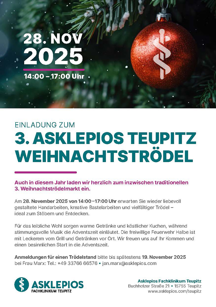 Anmeldungen für einen Trödelstand bitte bis spätestens 19. November 2025 bei Frau Marx: Tel.: +49 33766 66576 oder jan.marx@asklepios.com
