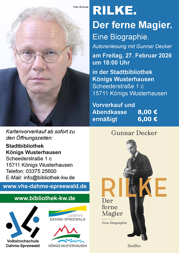 Der Todestag von Rainer Maria Rilke, ein schillernder Dichter der frühen Moderne, jährt sich dieses Jahr 2026 zum 100. Mal. Heinrich-Mann-Preis-Träger und Autor Gunnar Decker liest aus seiner neuen Biographie „Rilke. Der ferne Magier“ vor. Die Lesung findet in Zusammenarbeit der Kreisvolkshochschule Dahme-Spreewald mit der Stadtbibliothek Königs Wusterhausen statt.