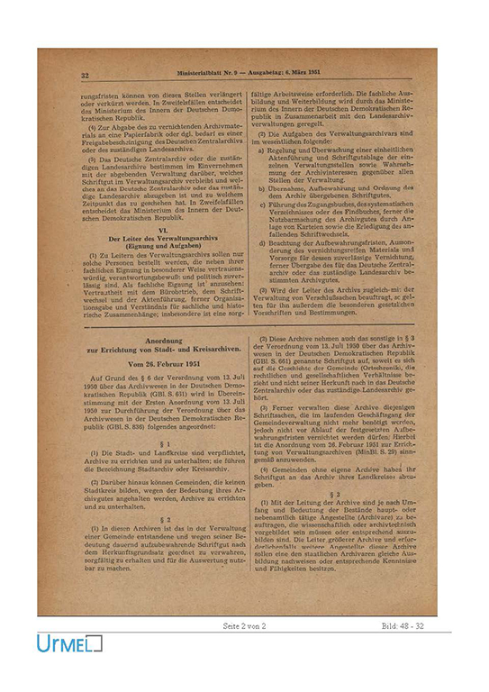 Abb: 1 und 2: Anordnung zur Errichtung von Stadt- und Kreisarchiven, 26. Februar 1951.